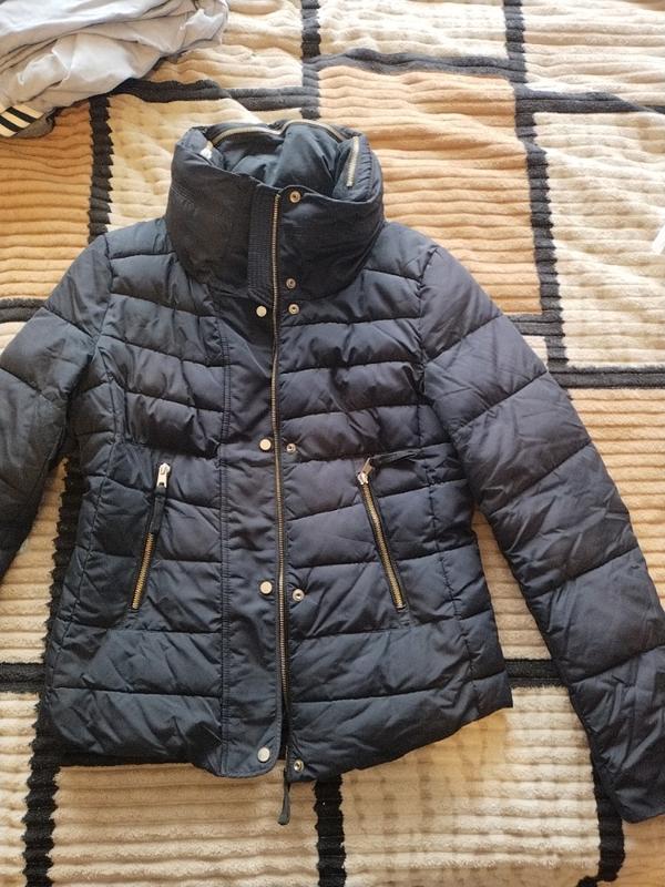 Зимняя куртка с объемным теплым воротом, приталенная, короткая, без капюшона и есть маленькая дырочка на рукаве сзади, есть на фото, все молнии рабочие, 2 кармана, очень теплая. Замеры под рукавами 47см, талия 43 см, по низу 47 см, длина 59 см, плечи 37 см, рукав 64 см.