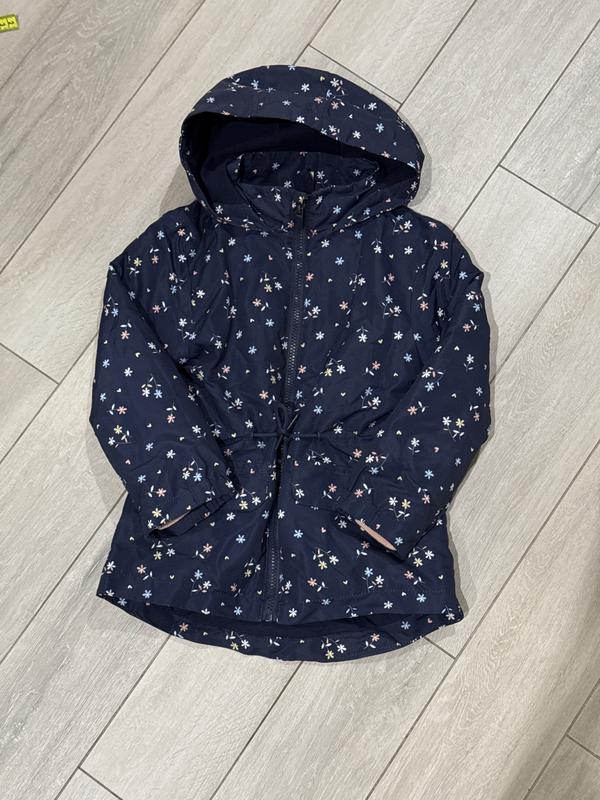 Куртка демі на дівчинку, всередині флісова кофта яка відстебується, тканина не продуває, не промокає, можна носити потім як вітровку, затягується на поясі Довжина спереду 48 по спині 54 Рукав від плеча 39 Плечі 32 Ог 37