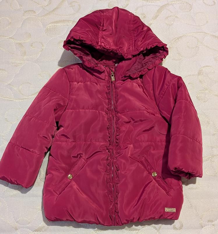 Яркая демисезонная куртка от известного бренда для вашей красавицы. Подойдет на осень, весну На возраст 2 года, но будет дольше, за счет удлиненной модели, капюшон можно отстегнуть. Длина 44 см Ширина 34 см Рукав от плеча 34 см