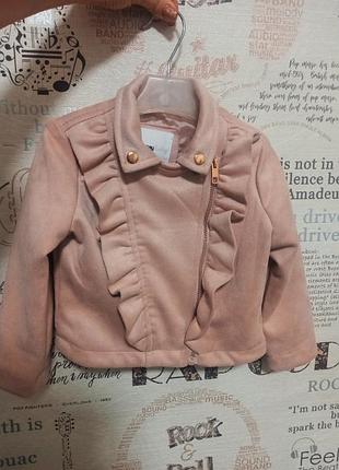 Нежная курточка для девочки Sinsay Baby, размер 86 см (примерно на возраст 1,5 г.). Материал – мягкий, приятный на ощупь велюр/замша (искусственная), с подкладкой внутри. Цвет - пудрово-розовый, универсальный и стильный. Модель с рюшами по переду и косой молнией, что придает ей модный вид. Есть декоративные кнопки на воротнике цвета розового золота. Состояние - отличное, без пятен и повреждений. Подойдет для теплой осени или весны, отлично комбинируется с сукками, юбками или джинсами. 💗