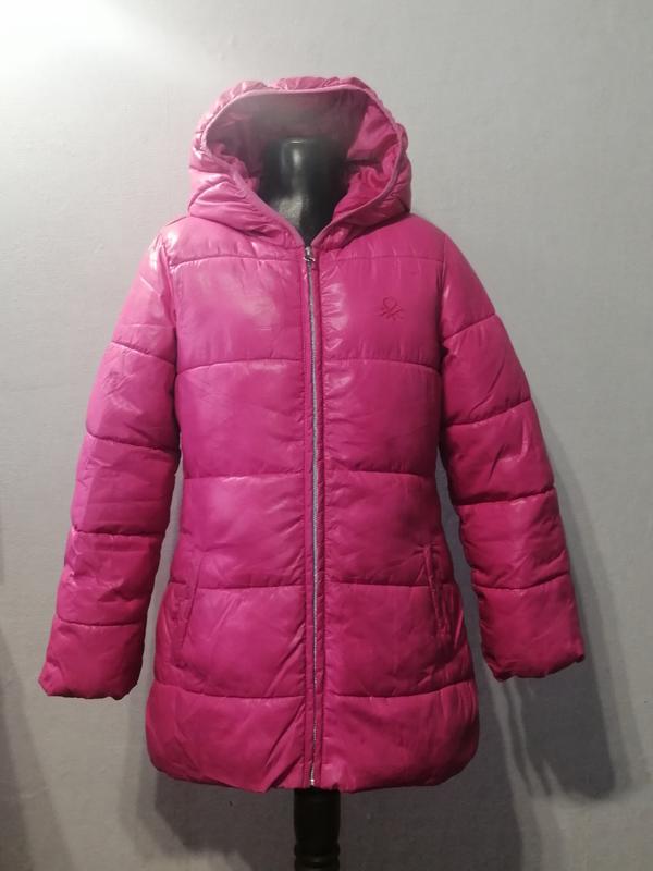 Теплая курточка на девочку р. 134. Длина 59-63 см, ширина под руками 42 см, рукав от капюшона 56 см. Есть небольшой дефект изнутри, зашитая дырочка, последнее фото.