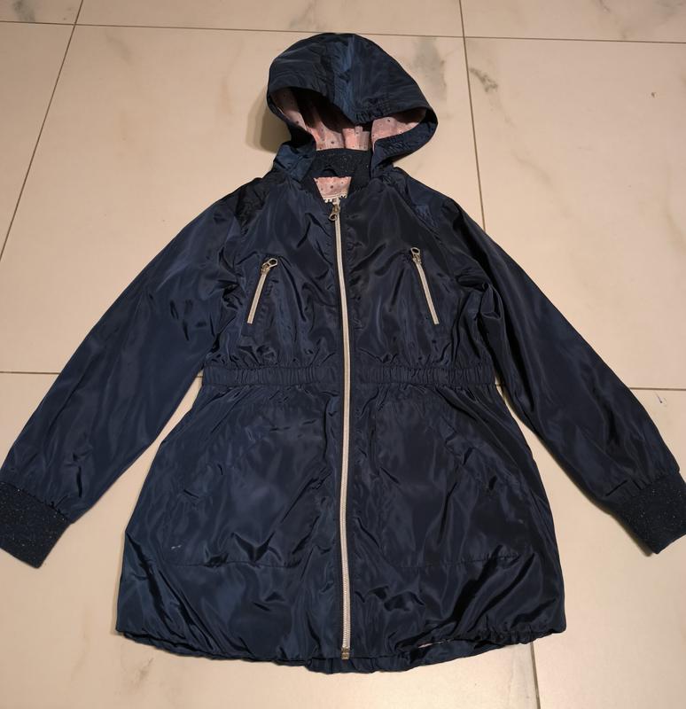 Тоненьку куртка вітрівка на дівчинку. Розмір 128-134. Стан відмінний, не рвана, без плям. Фасон подовжений. Тканина плащівка дюспо.