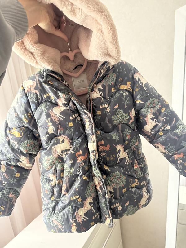 Куртка має принт з єдинорогами та іншими тваринами, а також хутряну підкладку на капюшоні.