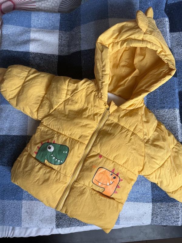 Жовта курточка з динозаврами, ~1,5–2 роки Легка та тепла курточка з капюшоном і вушками — справжній мастхев для маленького бешкетника! Дві кишеньки з динозаврами — вау-ефект гарантовано :) Довжина: 37 см Ширина: 34 см Рукав: 33 см У чудовому стані, без плям і пошкоджень. Ідеальна для ранньої осені чи весни. Супер-легка в пранні!