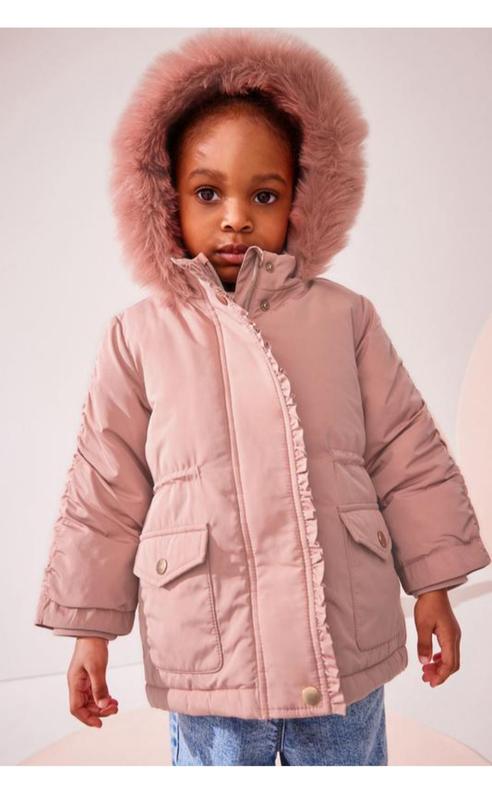 Водонепроницаемая парка с оборками и накладными карманами на 3-4 года. Носил ребенок аккуратно зимой. Можно стирать в стиральной машине. Материал: Основа 100% полиэстер. Подкладка 100% полиэстер. Наполнитель 100% переработанный полиэстер.