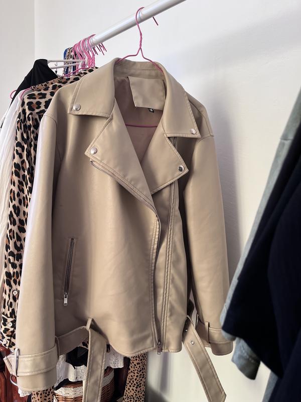 кожанка бежевого кольору, розмір М, підійде на L-XL має ремінь внизу і на рукавах, рукави на застібку ідеально на весну-теплу осінь дефекти на рукаві, чорні затертості, при носінні не помітні, відтерти не пробувала)