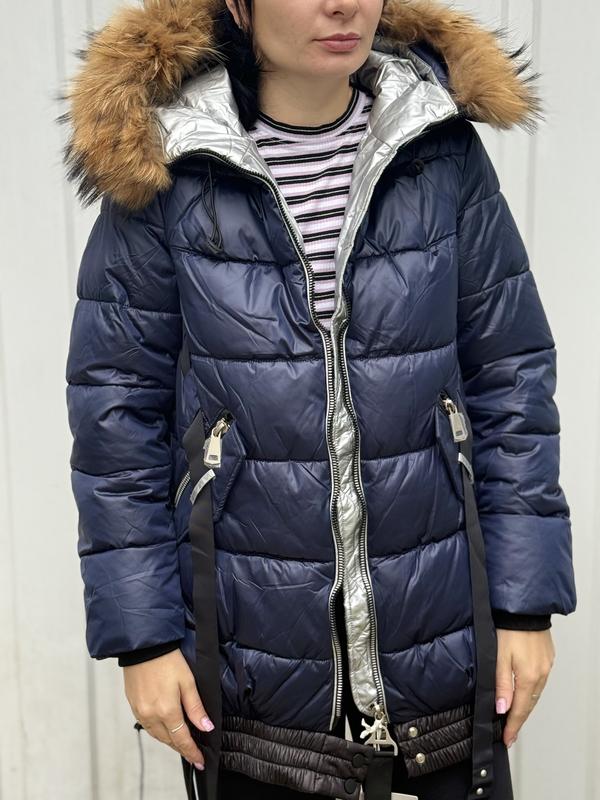 Тепла подовжена куртка глибокого синього кольору з металевими вставками та великим хутряним капюшоном. Має сучасний фасон із декоративними ременями, зручні кишені на блискавках і двосторонню застібку. Стильна, легка та неймовірно комфортна — чудовий вибір для холодної зими ❄️