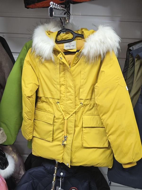 Новая, теплая, зимняя куртка для подростков, цвет горчичный, мех с капюшона снимается.