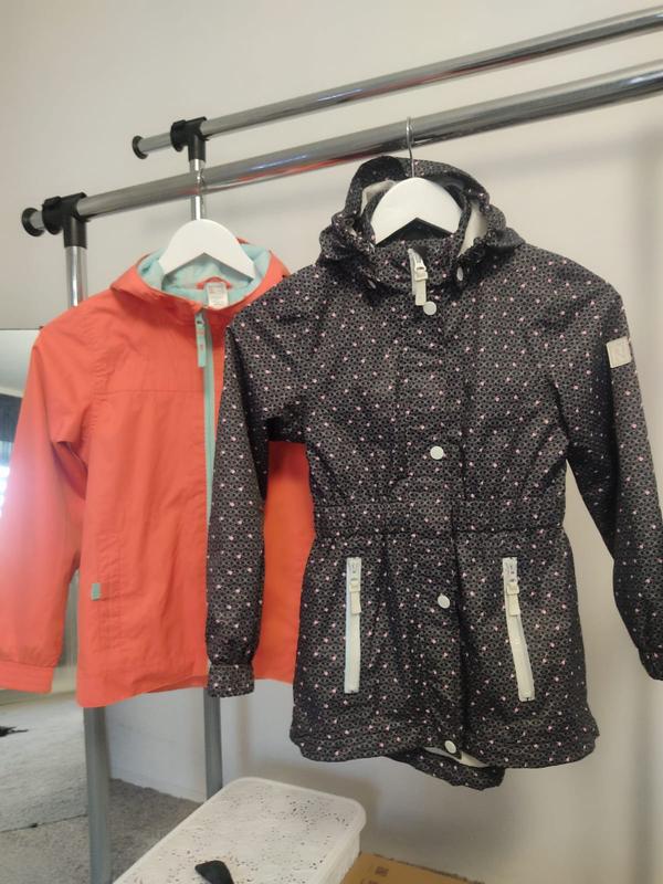Две детские ветровки 1️| Pomppa – темно-синяя с мелким узором, с капюшоном и карманами, утяжка на талии. Легкая, удобная, защищает от ветра и дождя. Состояние: отличный Рост: 128 2️| Quechua – коралловая, с молнией и капюшоном, компактная и практичная, идеальна для прогулок и путешествий. Состояние: отличный Рост: 133 142