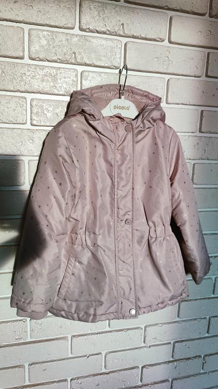 Удобная теплая куртка на девочку. Красиво стирается и действительно практична. Есть дефекты - затертые кнопочки и катышки на рукавах. При необходимости отправь замеры, по факту носили где-то до 112 см.