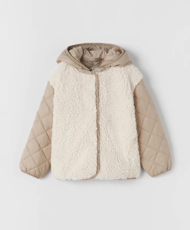 демисезонная куртка для девочки Zara, куртка из искусственного меха маховушка Zara. Бренд Zara. Манжеты внизу на резинке. 7 лет /122 см - длина 50 см, рукав от горловины 55 см, ширина под руками в полуобхвате 47см.Контрастная куртка с капюшоном и длинными рукавами. Застегивается на кнопки спереди. Светлый экрю.