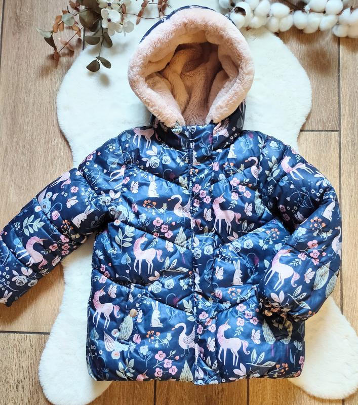 Теплая куртка от бренда Next для девочки в возрасте 4-5 лет, на рост 104-110 см ☃️🦄 Утеплена уютным розовым искусственным мехом, имеет два кармана и теплый капюшон. Очень симпатичный, и главное, немаркий принт, дающий возможность реже стирать куртку, а также позволяет широкий выбор аксессуаров разных цветов – к курточке подходят синие, розовые, голубые и фиолетовые аксессуары. 🧤🧣 Купили и носили на зиму, жалоб на холод не было ❄️ Состояние курточки между очень хорошим и хорошим. Из недостатков есть несколько зацепок, которые трудно заметить за счет активного принта, потертые кнопки на кармашках ( что тоже не сильно бросается в глаза). Недостатки отражены на последних фото. Также немного взбит наполнитель в самом низу куртки. В целом, состояние хорошее, мы бы продолжили с удовольствием носить эту курточку этой зимой, если бы не выросли с нее. Замеры: Длина 48 см Рукав 38,5 см Плечи 31 см Ширина под рукавами 40 см