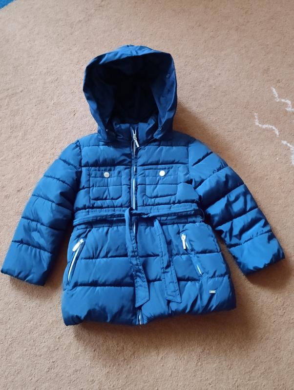 Синя куртка з капюшоном під пояс на блискавці для дівчинки ростом 110 см.Заміри:плечі 30 см,пог 35 см, довжина рукава 39 см,довжина куртки 50 см