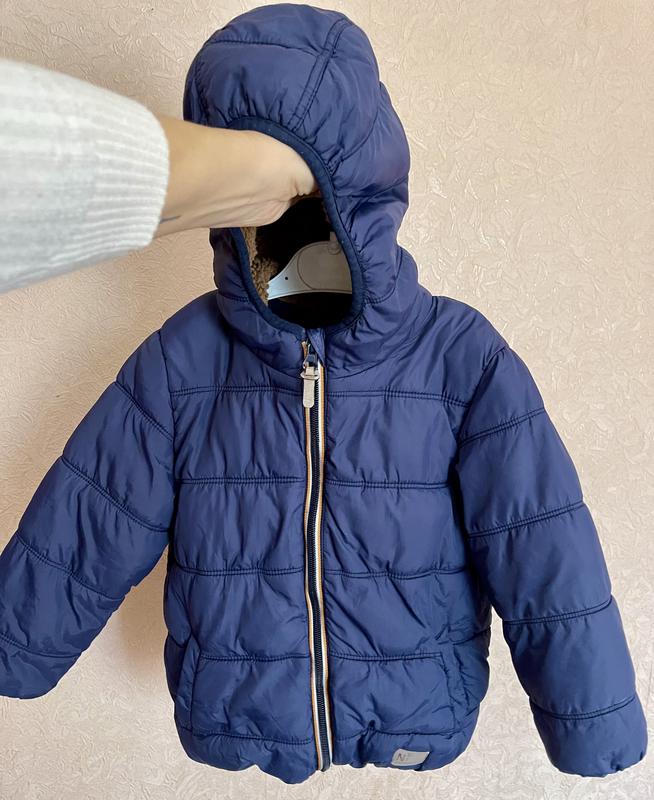 Тепла дитяча куртка Next, розмір 2–3 роки (98). Колір — темно-синій. Всередині тепла м’яка підкладка з штучного хутра (тіпа «тедді») у зоні спинки та капюшона. Утеплена, легка та зручна, підходить для прохолодної осені й м’якої зими. Капюшон не відстібається, блискавка працює добре. Є дві кишеньки з боків. Стан дуже хороший.