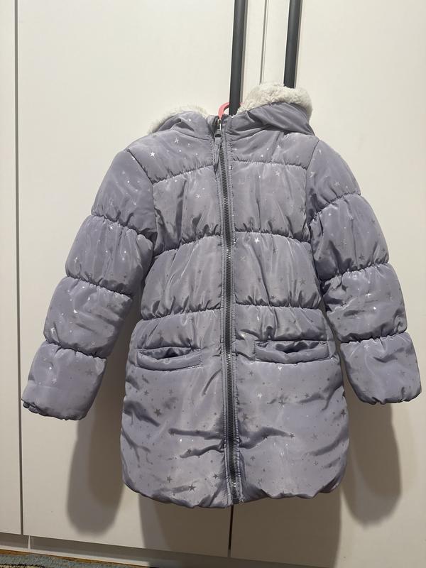 Теплесенька куртка-пуховик, приємного сірого кольору із зірочками, ідеально на 4-5 років, капюшон не відстібається, також утеплений. Куртка дуже практична і не боїться прання.