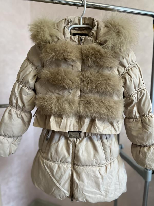 Продам теплу зимову курточку для дівчинки бежевого кольору. Капюшон відстібається, хутро теж можна зняти. Є пояс і дві кишені на блискавці. В комплекті йде жилетка з хутром (вдягається зверху куртки) — дуже зручно у вітряну погоду. Куртка легка, але тепла, гарно тримає форму.