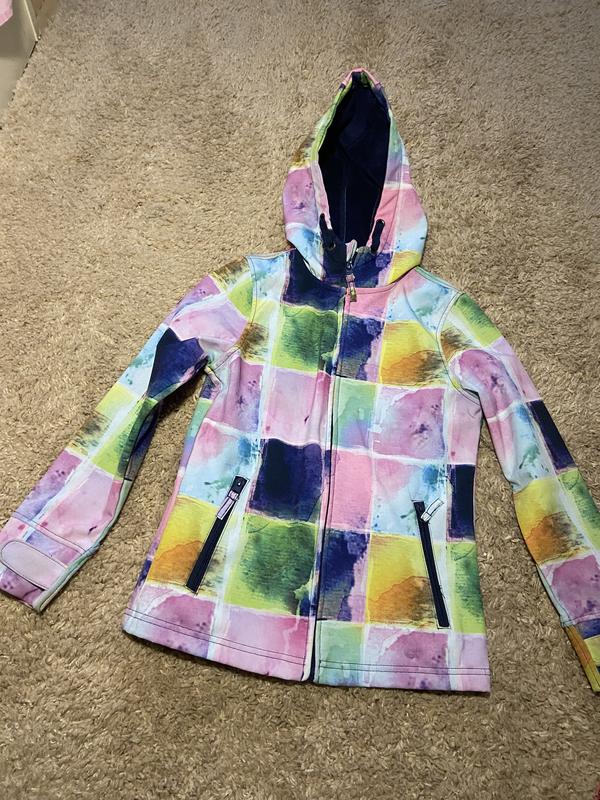 Класна куртка вітрозахисна,водовідштовхувальна,утеплена типу фліса,яскравий колір під акварель,Розмір вказаний 146,ми носили з 134 см,Із нюансів,на спині свтловідбиваючиа наліпка трохи протерлась,на фото вказала.Заміри довжина 53см,пог 39см,плечі 32см,рукав 51см