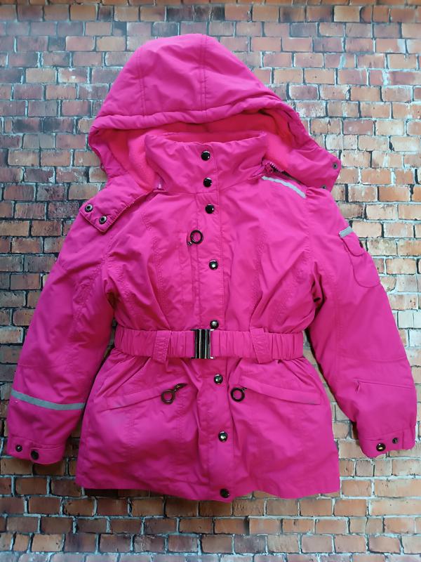 Зимняя куртка для девочки, розового цвета. Размер: 122см, 7 лет Состояние: есть нюанс на подкладке и пятна на кармане, показано на фото Замеры: Плечи 36см Рукав 44см ПОГ 38см ПОТ 38см, регулируется поясом Длина от плеча до низа 56см