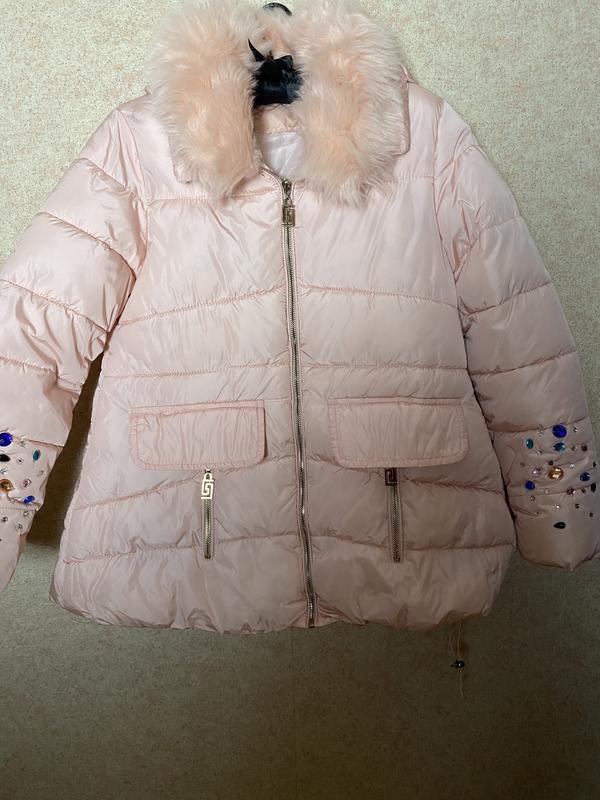 Розкішна тепла дута куртка. Зазначено дитячий розмір L, Зріст вказано 165. Довжина 67см, ширина під рукавами 46см, ширина внизу 61см (затягується гумкою). Рукав від шва 56,5 см. Хутро знімне
