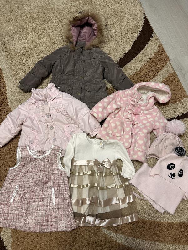 Продам пакет речей для дівчинки 1.Куртка парка F&F-розмір 18-24 2.Куртка рожева-74(9міс) 3.Пальтішко з сердечками- 0-3 міс 4.2 теплі шапочки і шарф 5.2платтячка 6-9 міс