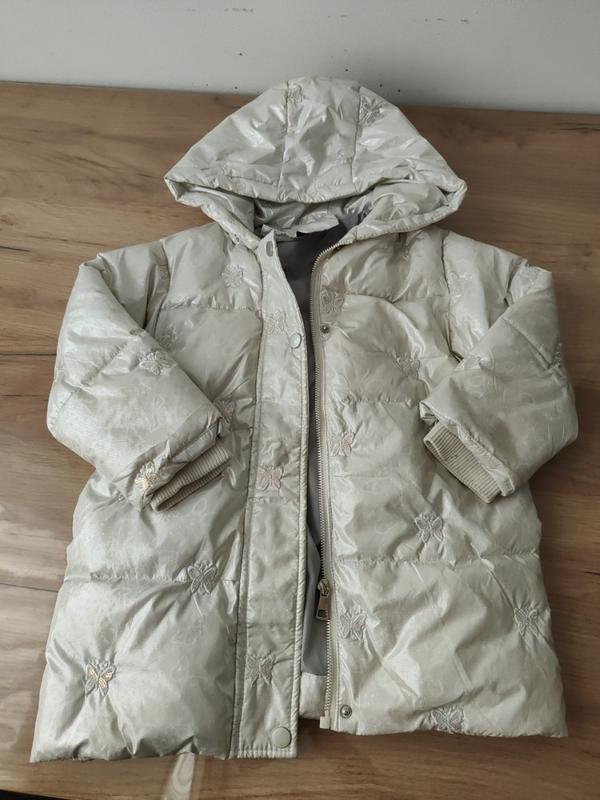 Теплая куртка для девочки на рост 98. Утепленная полиэстероа волокно и утиный пух. Из нюансов потерялся искусственный мех из капюшона пристегивается на пуговицы и манжеты под рукавом немного загрязнены.