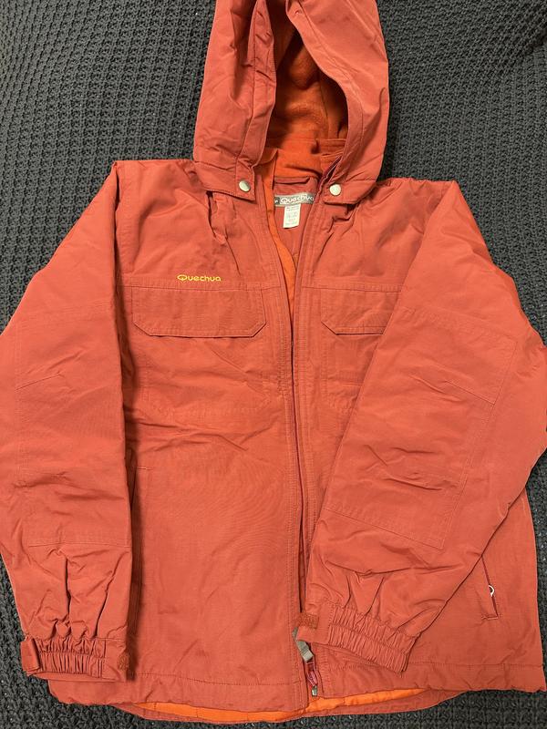 Дитяча туристична/лижна куртка Quechua розміру на 12 років. Вітро- та водонепроникна. Сезон: холодна весна, осінь. Має теплу підкладку, що дозволяє також носити і в гарну зимову погоду. Має функціональні кишені на грудях та з боків, знімний капюшон на блискавці та регульовані манжети. Мало ношена, у відмінному стані. Колір коралово-червоний. Довжина від плеча: 60 см Ширина: 50 см Довжина рукава від плеча: 55 см