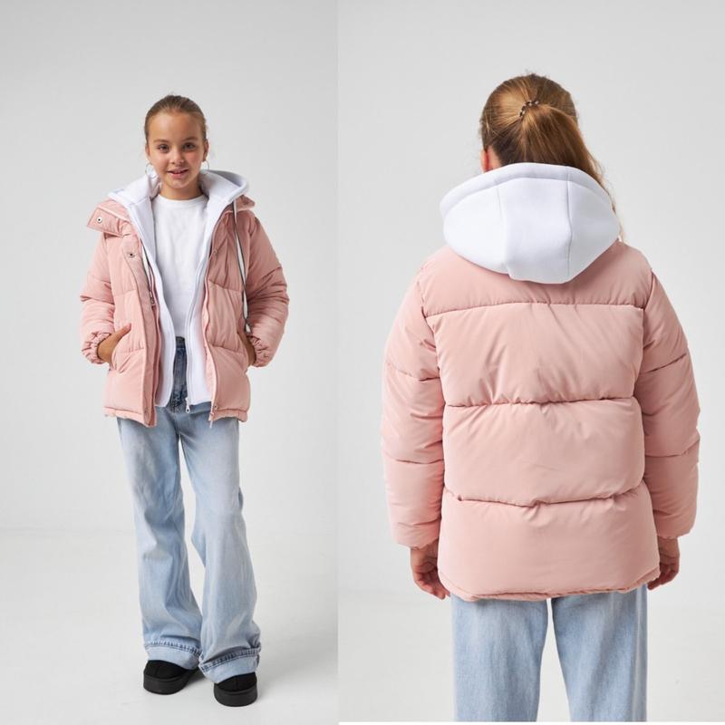 Тепла зимова куртка на пуху Застібається на блискавку та кнопки. Має ще одну внутрішню блискавку, яка застібає планку з тринитки на флісі. Капюшон з тринитки на флісі - обшитий, стягується шнурівкою. Великі зручні кишені на флісі. Тканина - плащівка, утеплювач - екопух. Колір - персик. Заміри: 146 довжина - 57см, напівобхват грудей - 48см, рукав від леча - 51см. 152 довжина - 59см, напівобхват грудей - 49см, рукав від леча - 53см.
