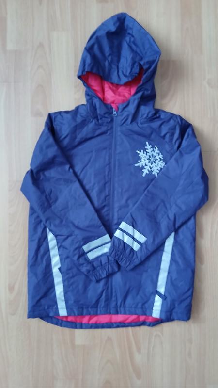 Курточка для девочки, зимняя. Для активного ребенка. Общее состояние отличное, чуточку стерлась светоотражающая лента на снежинке. Карманы на замке. Замеры на фото