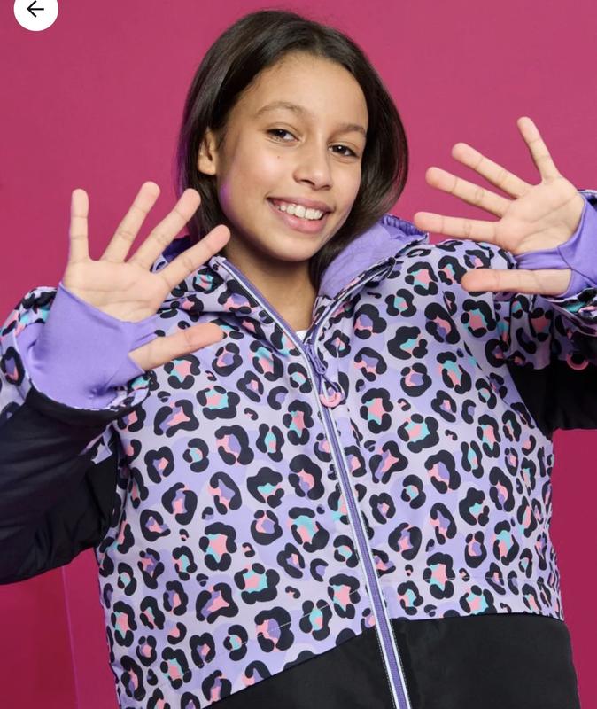 Стильна та практична лижна куртка для щоденного носіння та зимових канікул. Модель у спортивному та міському стилі, зручна для активного відпочинку та прогулянок. Особливості: Крій: regular, довжина до стегон Комір: стійка Застібка: блискавка Рукави: подовжені з манжетами Кишені: без кишень Каптур для додаткового захисту від вітру Матеріал: поліестер Візерунок: леопардовий принт у кольорових блоках (чорний, фіолетовий) Сезон: осінь, зима Водонепроникність: ні Модель на фото носить розмір 146, зріст моделі – 142 см.