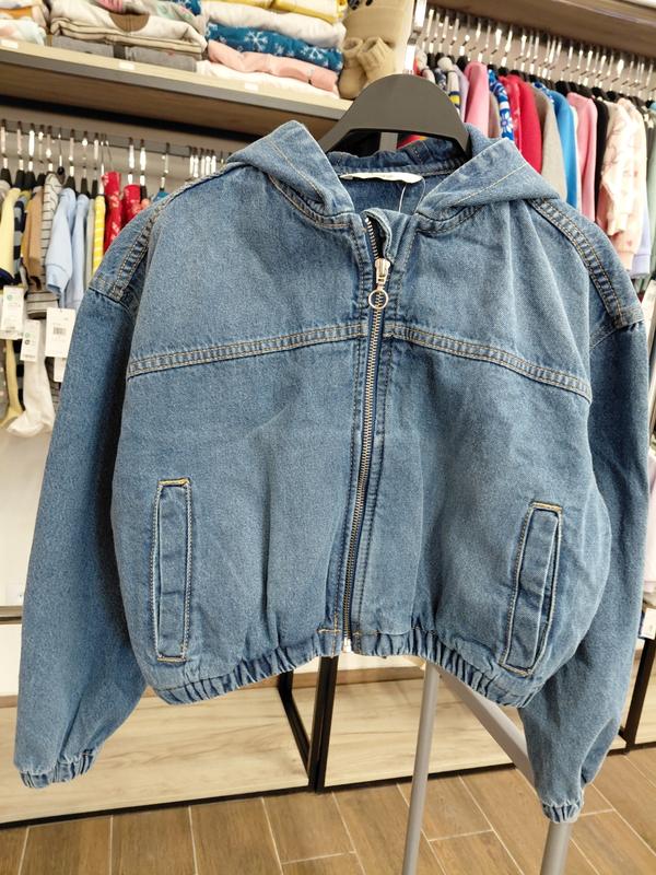 укороченная джинсовая куртка синего цвета с капюшоном. Она имеет стиль оверсайз и застегивается на молнию.