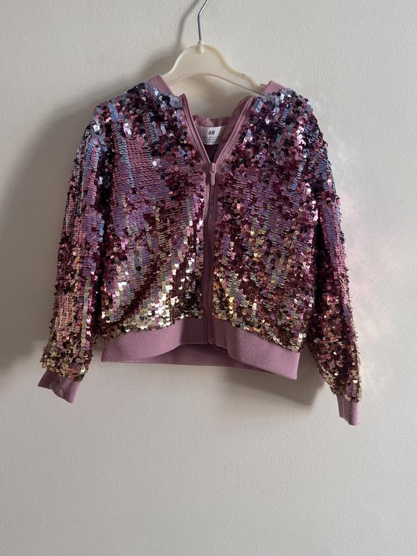 Це дитяча куртка-бомбер H&M з двосторонніми паєтками ,змінює колір залежно від того, як провести по ній рукою. Розмір і детальна інформація вказана на бірці у фотокаруселі. Нова така коштує близько 1000 грн