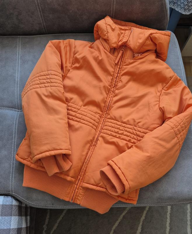 Теплая куртка Rotation оранжевого цвета в отличном состоянии. Размер соответствует хс-с, 152 см. Очень теплая, наполнитель не сбит, внутри частично на флисе. Капюшон тоже теплый, снимается. Снаружи имеет два кармана и внутри еще два на липучках, в большей можно носить телефон. Резинки на рукавах и снизу не растягиваются. длина по спинке 64, ширина по плечам 43 см, ширина под рукавами 53 см, рукав без/с резинкой 55/61 см, ширина по низу 50 см