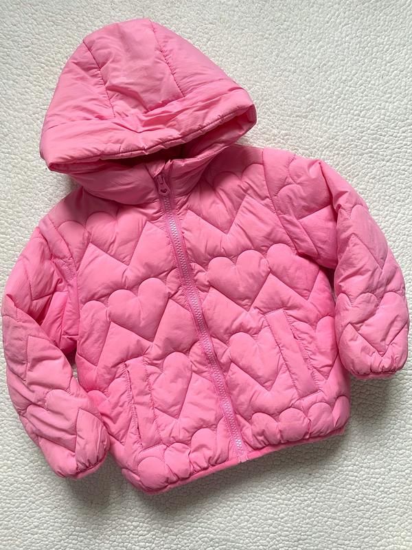 Курточка стьогана в сердечко, яскравого рожевого кольору. Утеплена синтепоном. Розмір 3-4 роки на зріст 104 см. Стан майже нової, без жодного нюансу, нову брали за 1200. Виміри надам при потребі