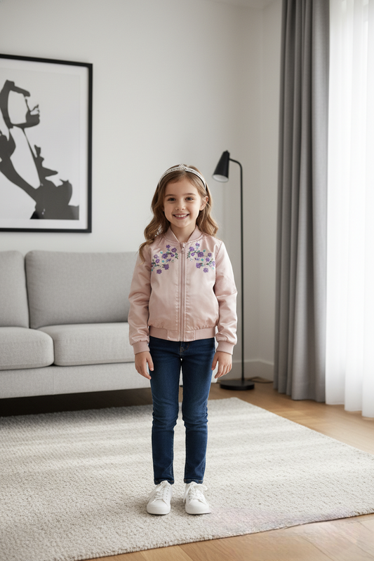 Розовая бомбер-куртка для девочки с цветочной вышивкой Бренд: So Cute Размер этикетки: 98 - Цвет: пудрово-розовый с атласным блеском Дизайн: бомбер - застежка на молнию спереди Декор: насыщенная цветочная вышивка в оттенках фиолетового, синего и белого на груди - Отделка: розовые ребристые манжеты на воротнике, манжетах и подоле - Рукава: реглан, обеспечивающий свободу движений Внешний материал: гладкий, слегка блестящий - Подкладка: гладкая, розового цвета Практичные детали: удобная молния, петля для подвешивания Идеально подходит в качестве легкой переходной куртки для девочек. Стильная и удобная.