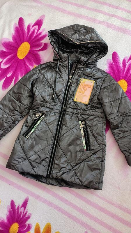 Куртка на девочку размера 122 на осень, весну, теплую зиму. Цвет графитовый с переливом. капюшон отстегивается.В очень красивом состоянии молния рабочая дырок пятен нет. Замеры указаны на фото.