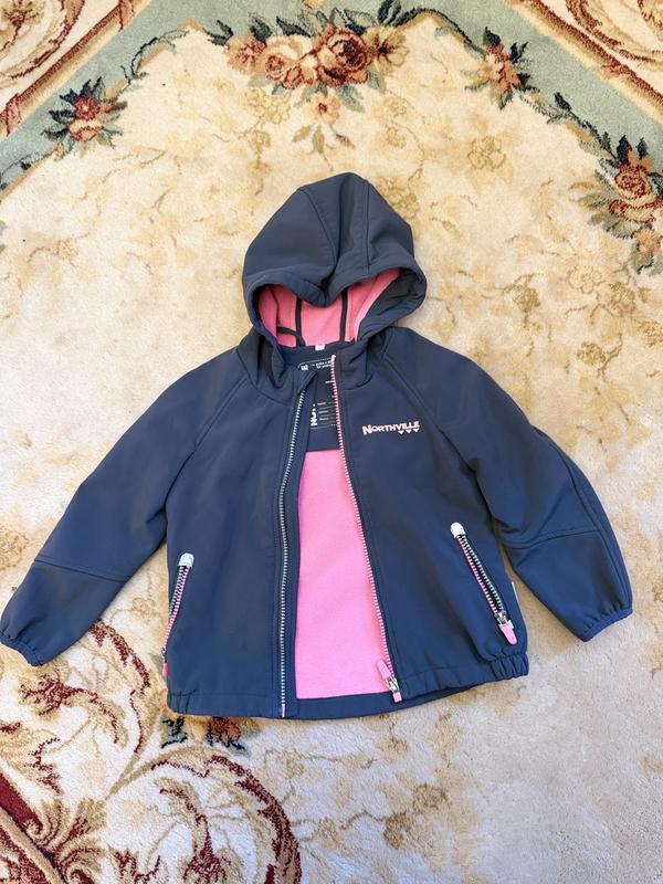 Вітрозахисна куртка Всередині тепла підкладка (фліс) Дуже зручна, ідеальна на весну/осінь Гарний колір: темно-сірий з рожевими вставками Якісні блискавки, кишені на замках.