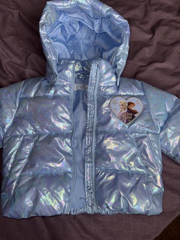 Стьобана, м'яка куртка з водовідштовхувальної функціональної тканини з мерехтливим, металевим покриттям та аплікацією на грудях.Знімний капюшон, комір-стійка. Відмінний Стан. Ніяких розривів, дірок або плям.