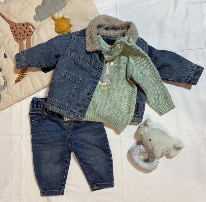 Дуже класна та стильна курточка next з манімальним утеплення. Дуже зручно защіпається на кнопочках. На весну підходить ідеально. Розмір 3-6 місяців. Вʼязаний светр приємного зеленого кольору з гусочкою. Розмір 68. Дуже мʼякий до тіла на двох ґудзиках біля шиї. Джинси також next, на 3-6 місяців. Без утеплення. Дуже зручні на стильні.