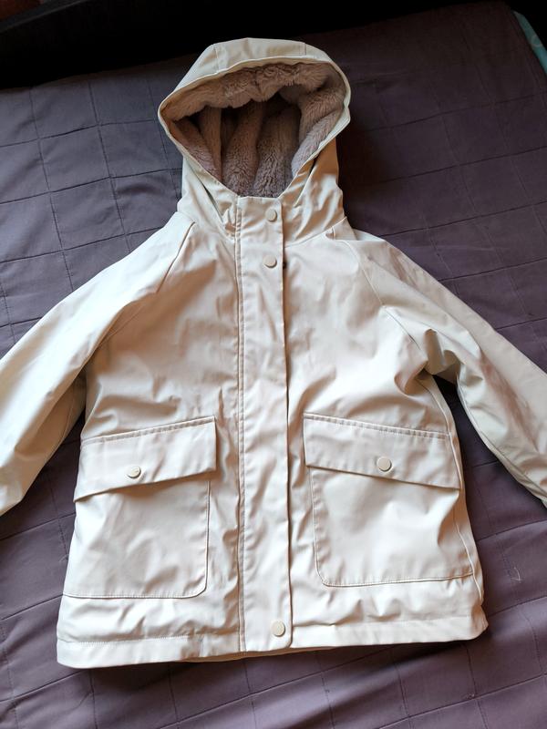Стильная и класснячья куртка для девочки от известного бренда. Куртка хорошего качества, теплая, подойдет на холодную весну, сразу после зимы. Куртка свет бежевого, ближе к молочному цвету, ткань непромокаемая, внутри мягкий мех. Стан куртки идеален, но есть нюансы: чуточку стерлась кнопка на кармане и небольшой след от ампулы внизу куртки, почти не заметно. Показала на двух последних фото. Замеры: длина 50 см, ширина под рукавами 42 см длина рукава от ворота 46 см.