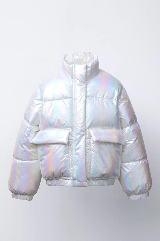 Стьобана демісезонна куртка Zara з високим коміром і довгими рукавами на резинці. Прихована застібка-блискавка спереду з планкою на кнопках. Низ на еластичній резинці. Накладні кишені з клапаном і кнопкою спереду.