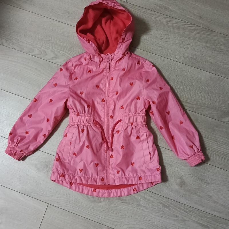 Стильна демісезонна курточка фірми George. Ніжно-рожевого кольору з милим принтом сердечок ❤️ Має капюшон, застібається на блискавку, по талії – резинка зі шнурочком. Є дві зручні кишені. Легка, комфортна, підійде на весну/осінь.Вік 3-4 рочки.Зріст буде 98-104см.Хоча на бірці пише 104-110см.Але орієнтуйтесь по замірах.Заміри на фото.