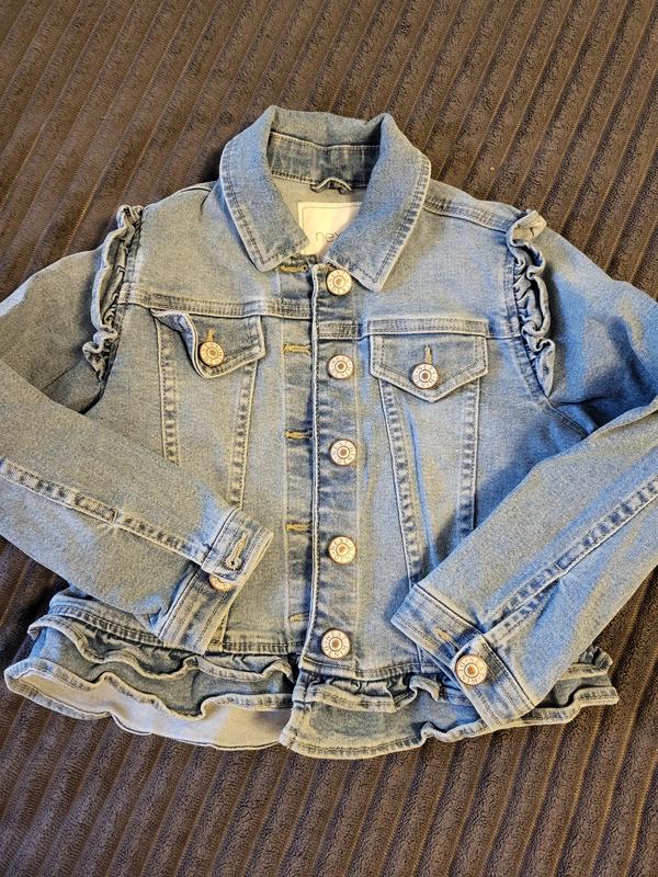 Куртка джинсовая с рюшами на 5 лет next. Очень красивая, с рюшами. Замеры: длина- 38, ширина- 34, рукав- 39 Без пятен.