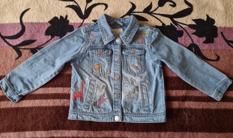 Джинсова курточка для дівчинки від бренду next в дуже гарному стані.На 3-4 роки, зріст 104. Довжина від шиї 34 см, під ручками 33см, рукав від шиї 42см.