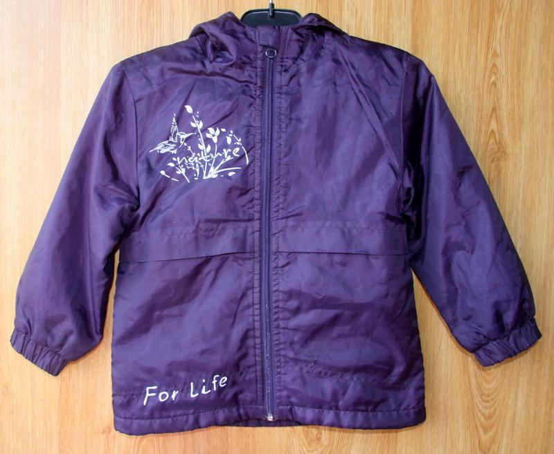 Легкая весенняя курточка-ветровка для девочки. Подкладка - флис. Без утеплителя. Практичный темно фиолетовый цвет. Застежка-молния, 2 кармана. Длина по спинке 45 см, длина рукава - 34 см. Есть небольшая потертость в районе левого кармана