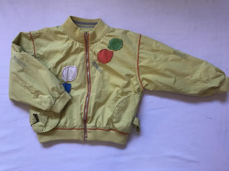 Дитячий бомбер жовтого кольору. З нашивками. Є дефект-на замку немає собачки, проте замок справний. Плечі: 37см Ширина: 40см Рукава: 35см Довжина: 40см