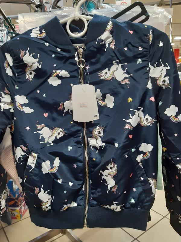 Оригинальная куртка для девочки с принтом единорогов. На молнии, боковые карманы на манжетах. Есть подкладка. Смотрится очень стильно на ребенке. Возраст 2 года 3 года Сезон Осень Лето Весна Состав 100% полиэстер Подкладка: 100% полиэстер Рост 98 см