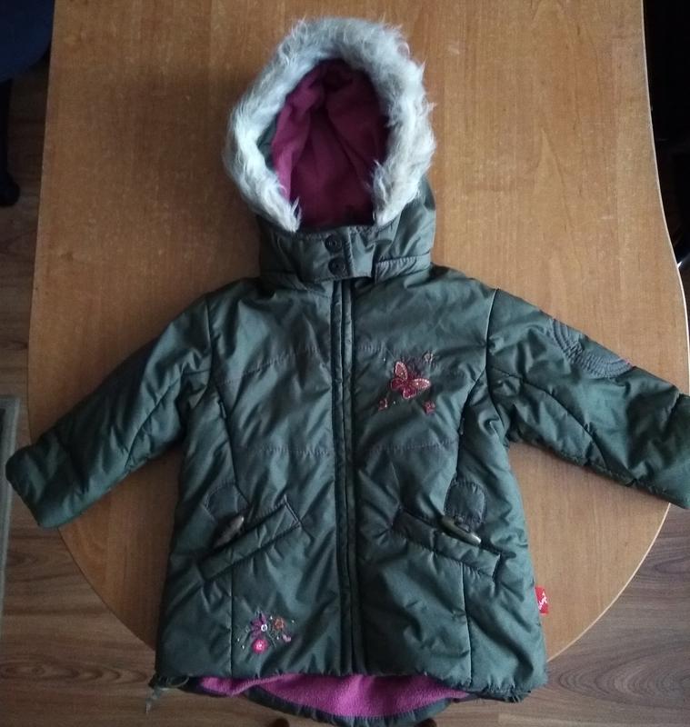 Куртка детская на девочку 6 мес,68 см.,ПОГ 32 см,длина по спинке 40 см,плечо 8 см,рукав 22 см.Утеплитель: синтепон,подкладка: флис.В отличном состоянии.Цвет :хаки.Производство Германия.
