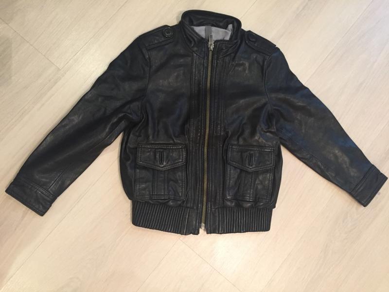 куртка бомбер из натуральной кожи черного цвета, Mango. На бирке указан возраст 3-4 года, но дочь {высокая худенькая} носила лет до 6-ти под тонкую футболку. Воротник стойка, застежка молния по центру куртки {благодаря чему унисекс}, низ прилегающий на резинке, рукава с манжетами на пуговицах, спереди 2 накладных кармана на пуговицах. Состояние кожи отличное, без потертостей и заломов с внешней стороны.