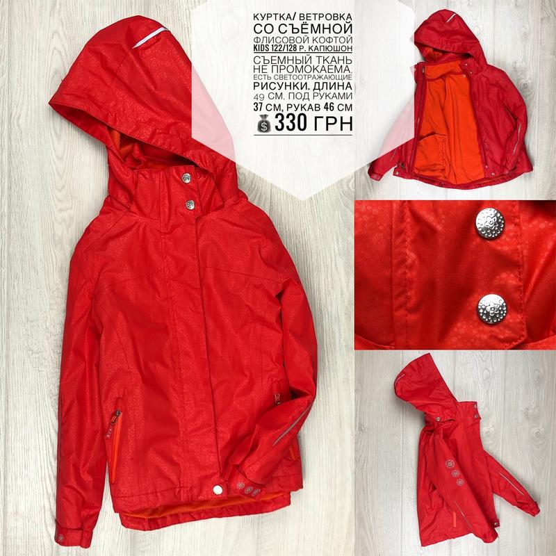 Куртка/ ветровка со съёмной флисовой кофтой Kids 122/128 р. Капюшон съемный ткань не промокаема, есть светоотражающие рисунки. Длина 49 см, под руками 37 см, рукав 46 см