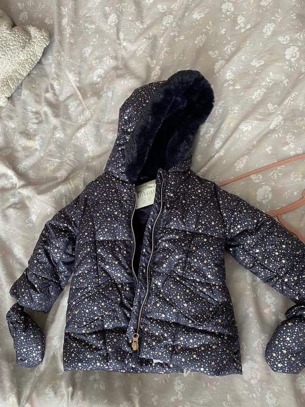 Куртка с Англии приехала, не успели и одеть, есть все бирки, цвет насыщенный синий с золотыми звездочками, есть варежки